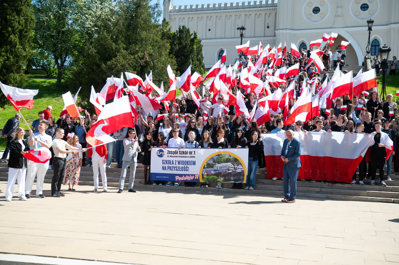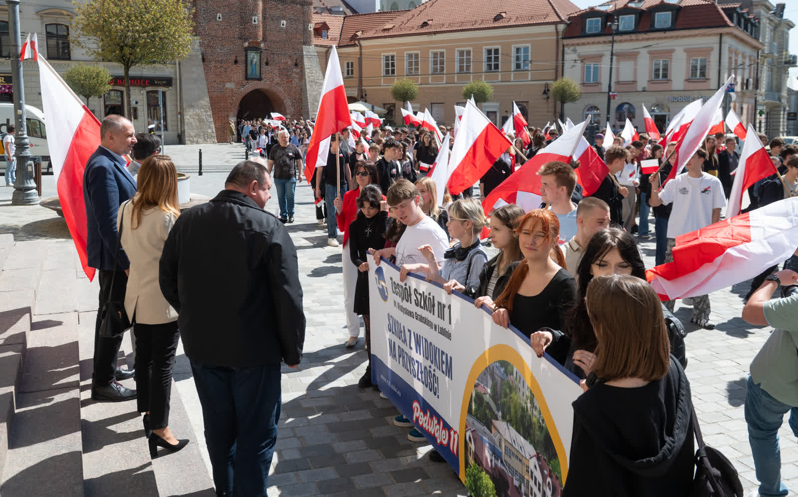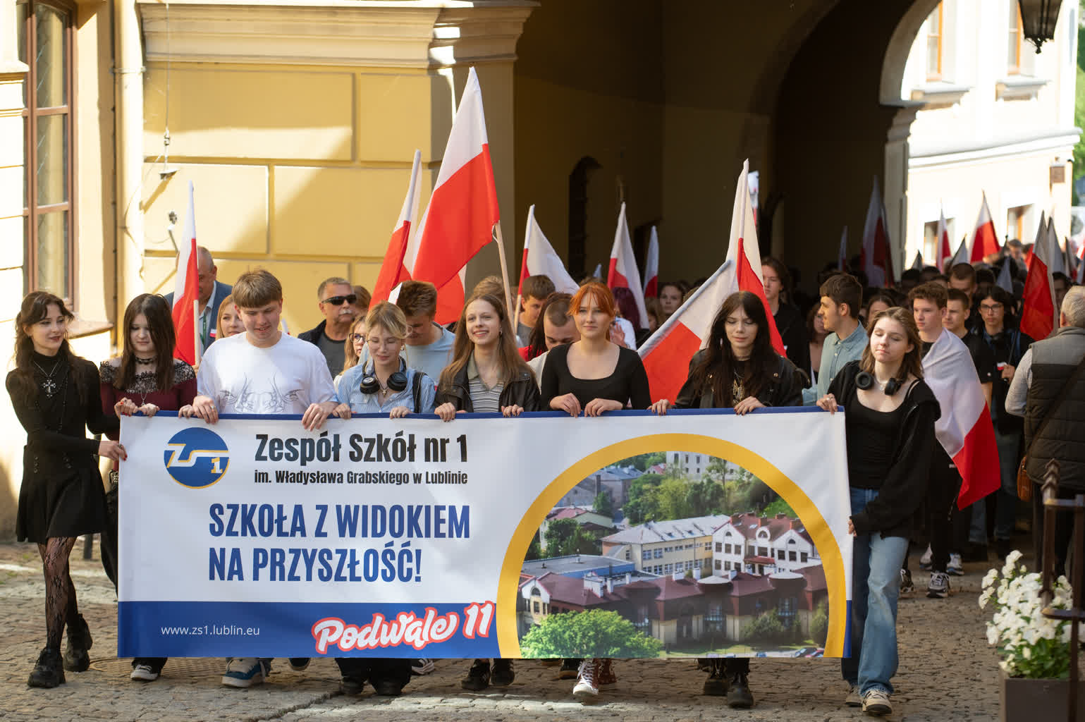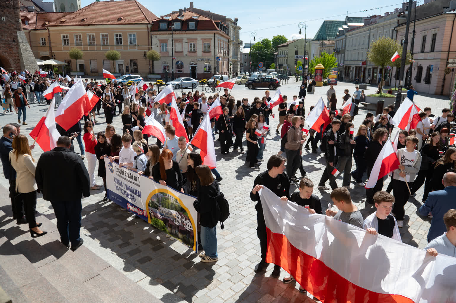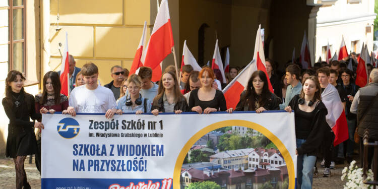 Z okazji przypadającego 2 maja Dnia Flagi społeczność Zespołu Szkół nr 1 im. Władysława Grabskiego zorganizowała patriotyczny przemarsz z biało-czerwonymi flagami sprzed budynku szkoły na plac Litewski.