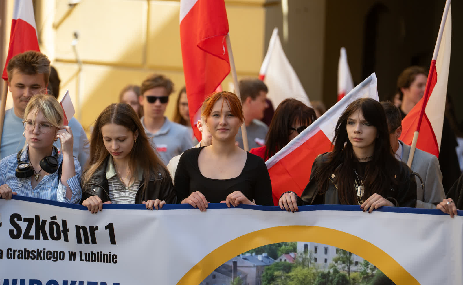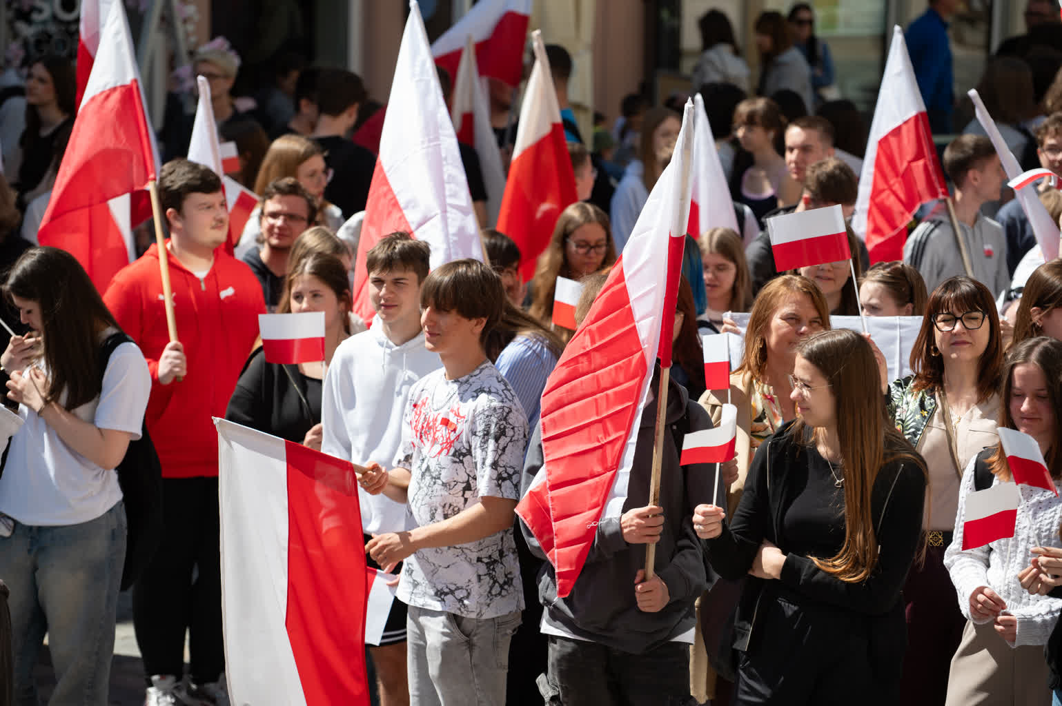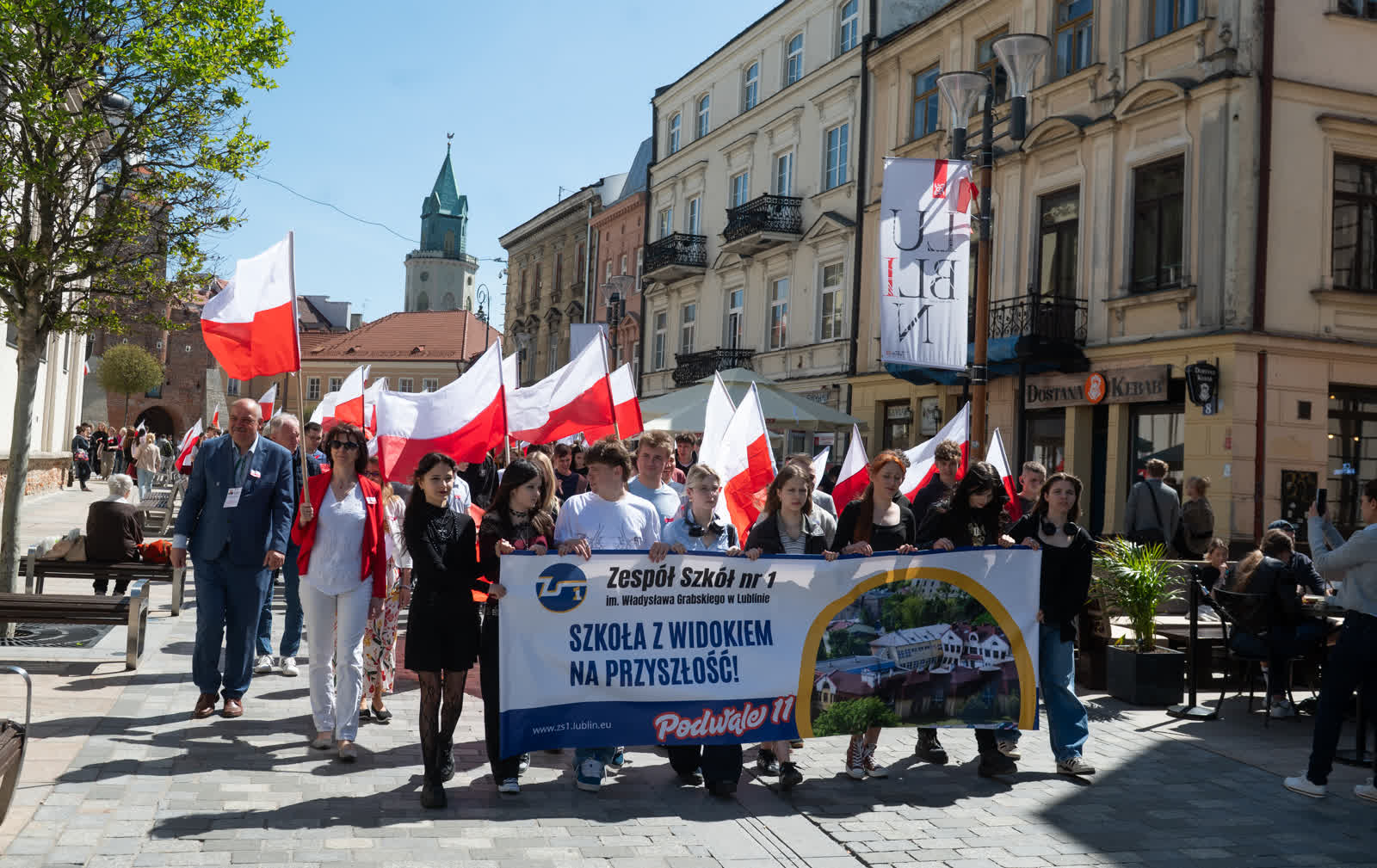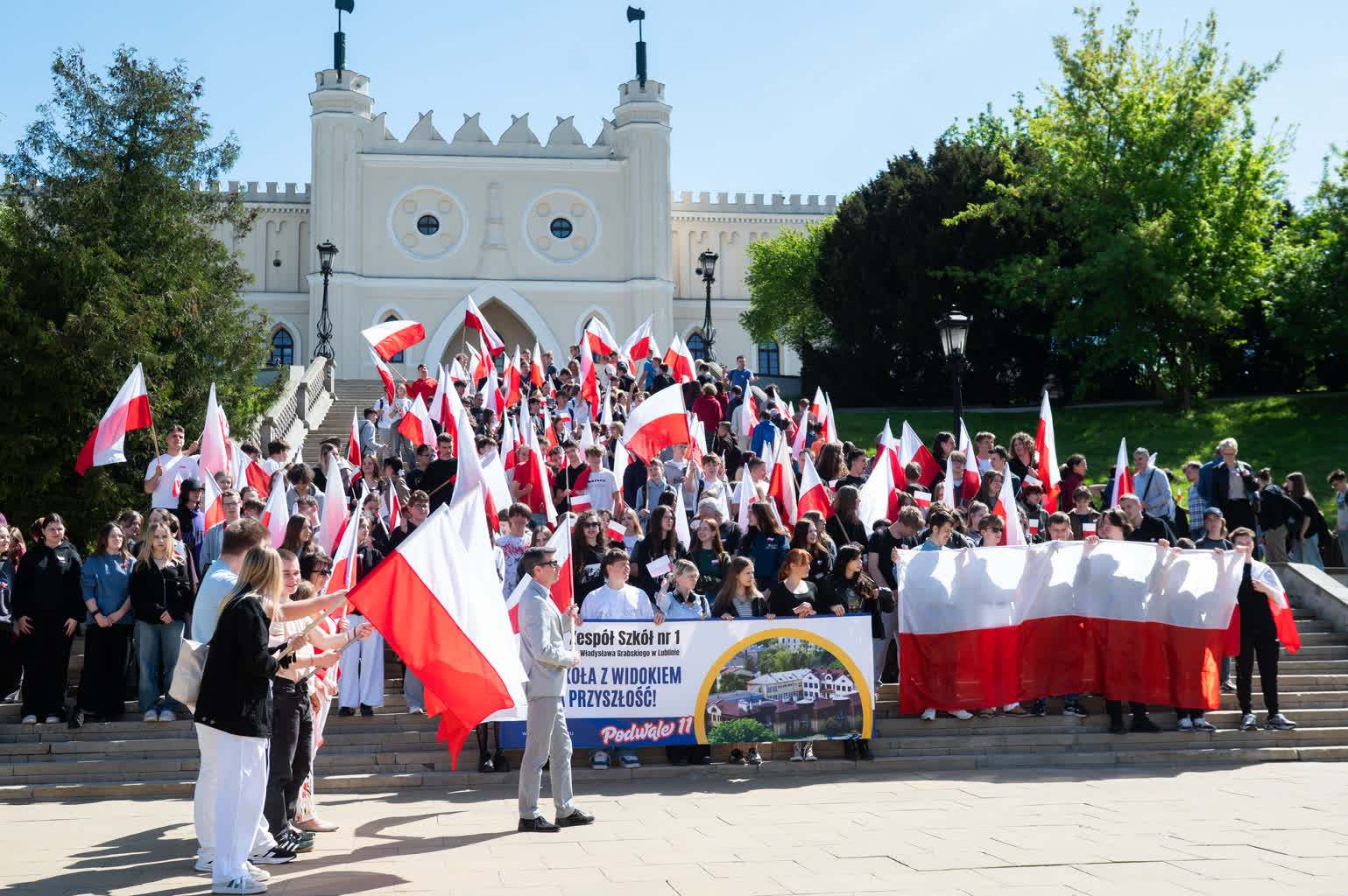 Z okazji przypadającego 2 maja Dnia Flagi społeczność Zespołu Szkół nr 1 im. Władysława Grabskiego zorganizowała patriotyczny przemarsz z biało-czerwonymi flagami sprzed budynku szkoły na plac Litewski.