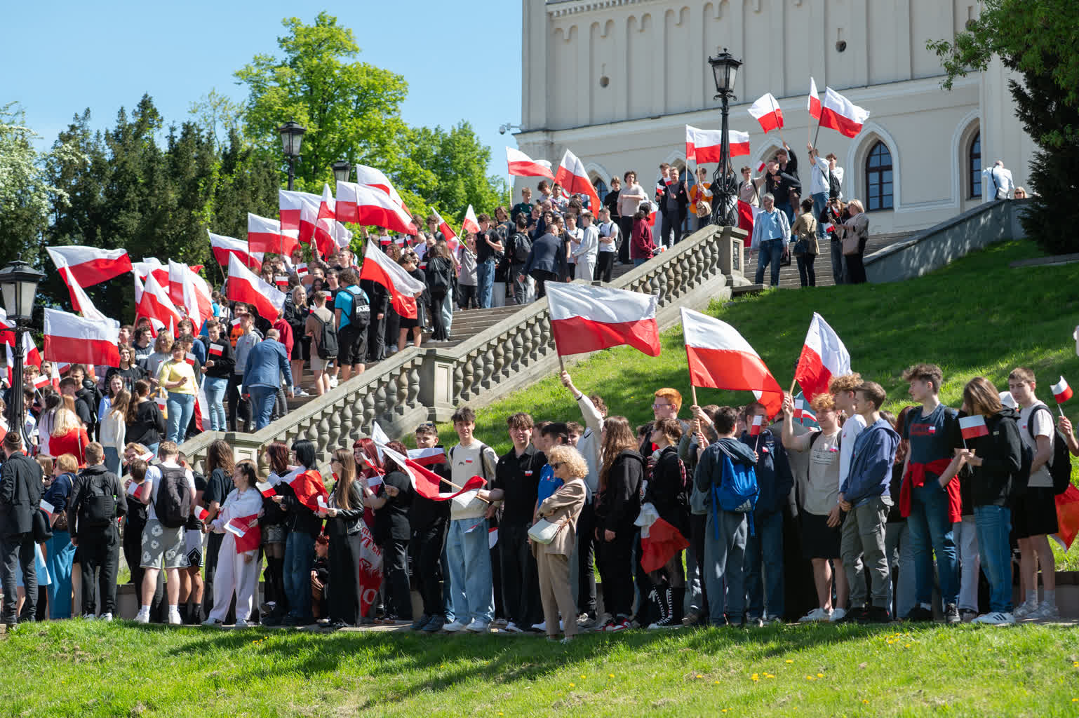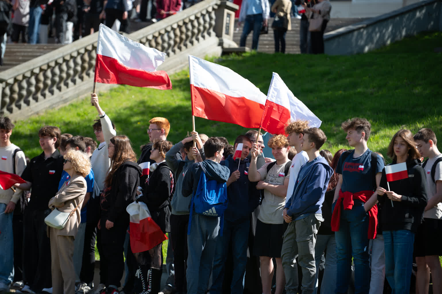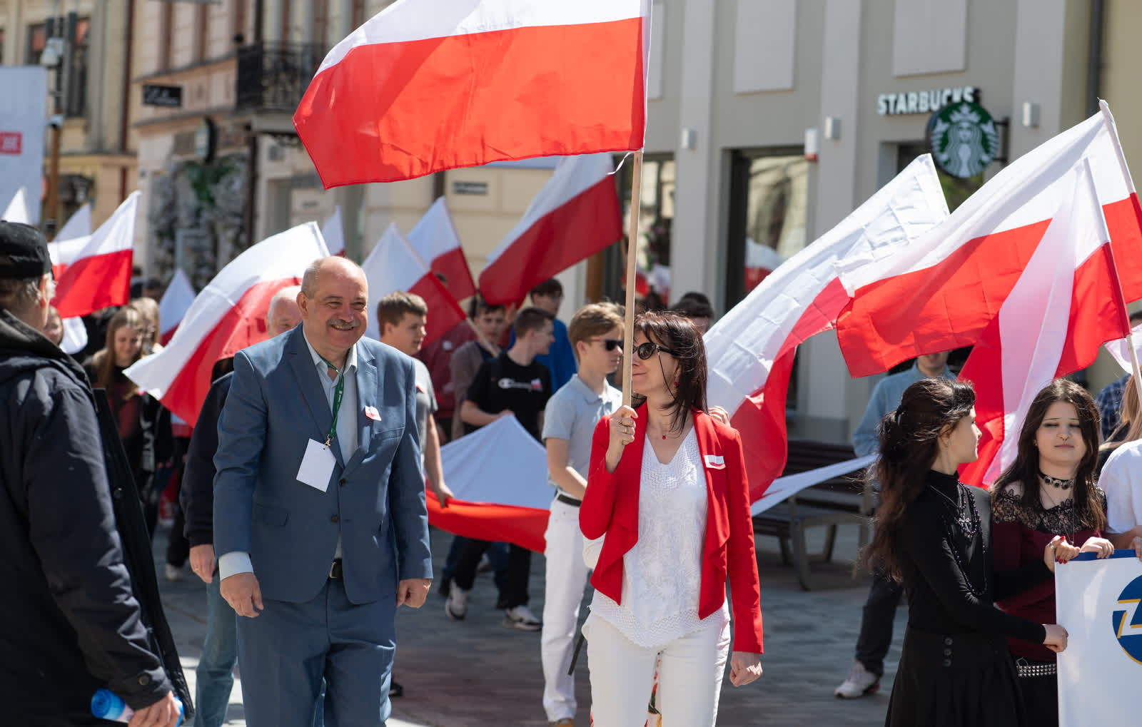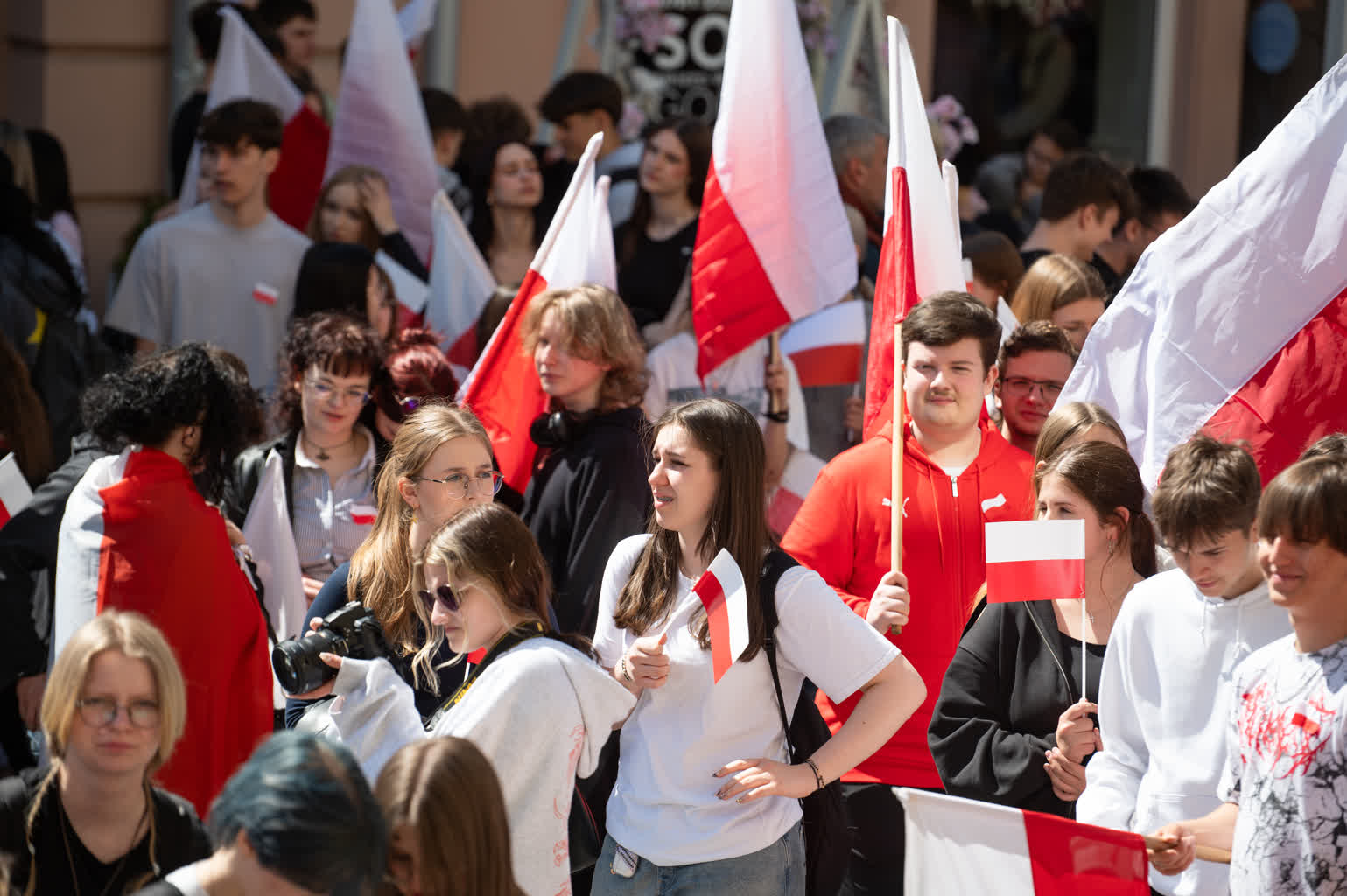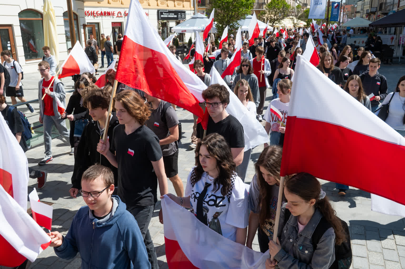 Z okazji przypadającego 2 maja Dnia Flagi społeczność Zespołu Szkół nr 1 im. Władysława Grabskiego zorganizowała patriotyczny przemarsz z biało-czerwonymi flagami sprzed budynku szkoły na plac Litewski.