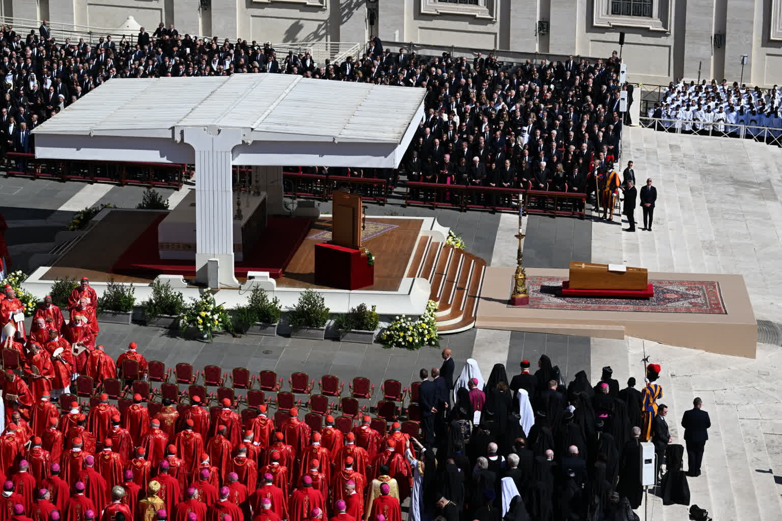 To była jedna z największych w historii ceremonii pogrzebowych. Przybyło około 160 delegacji, kilkudziesięciu przywódców państw, wśród nich prezydent USA Donald Trump z małżonką Melanią, przywódca Ukrainy Wołodymyr Zełenski z małżonką Ołeną. Obecny był prezydent RP Andrzej Duda z małżonką Agatą Kornhauser-Dudą. Był też były amerykański prezydent Joe Biden z żoną Jill.