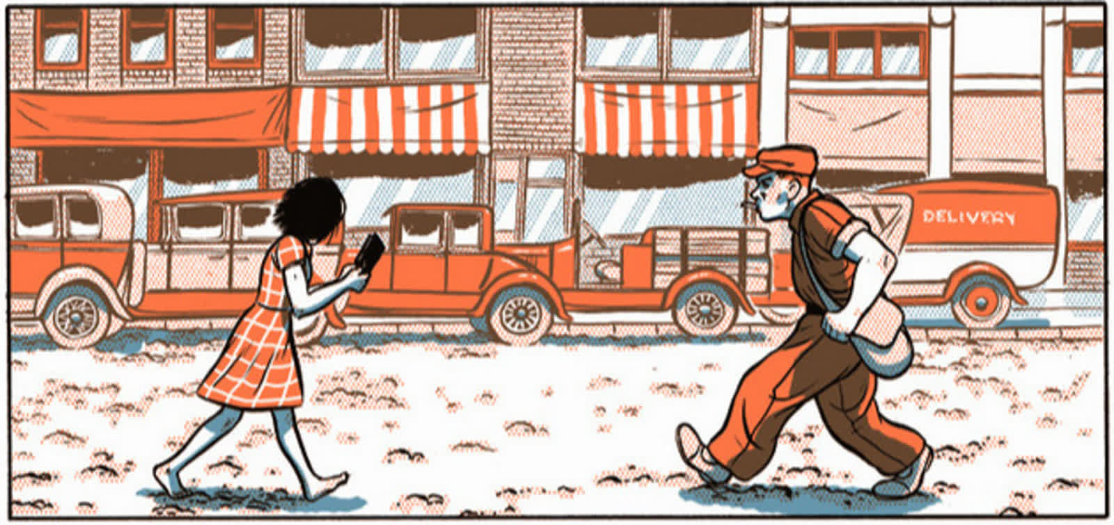 Robota jak każda inna to adaptacja powieści Virginii Reeves, efektownie barwiona przez Inkera kolorem pomarańczowym i narysowana stylówą zupełnie odmienną od tej, jaką autor zastosował w pierwszym opublikowanym w Polsce komiksie. O graficznym nawiązaniu do epoki już mówiłem; dodam jeszcze, że pełno tu odpowiednio powstawianych na plansze kresek oraz scen narysowanych niezwykle precyzyjnie – chociażby tej z psami, finalizowanej w leśnych chaszczach.