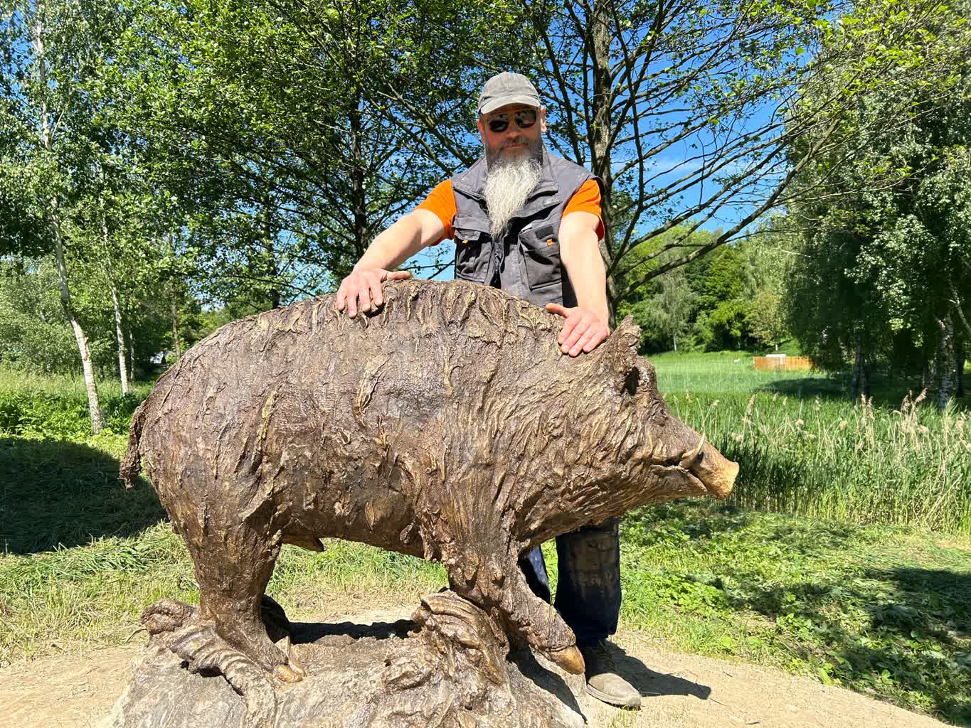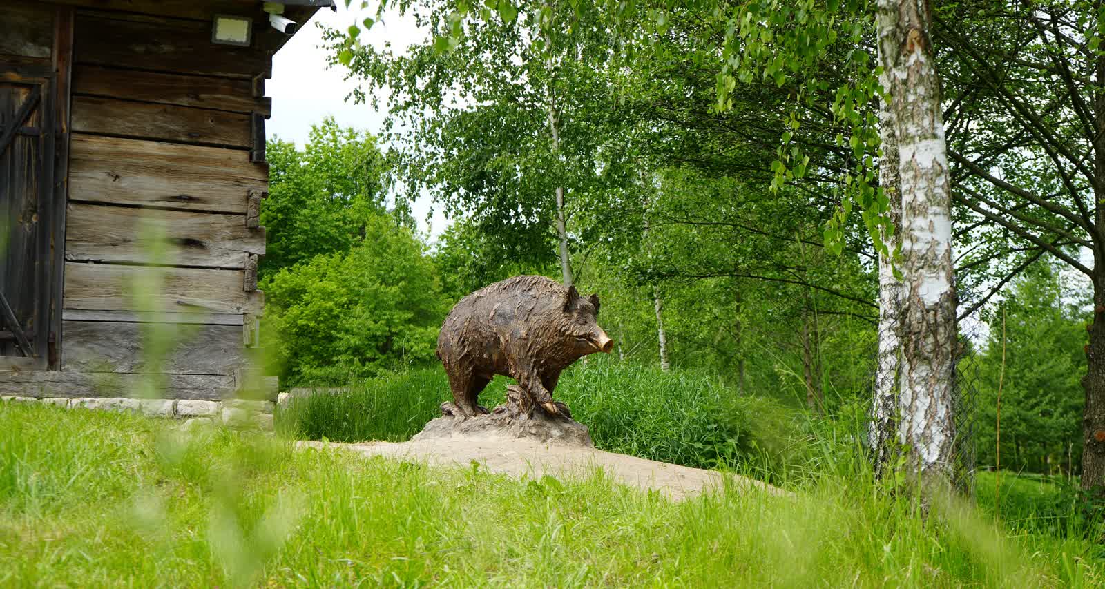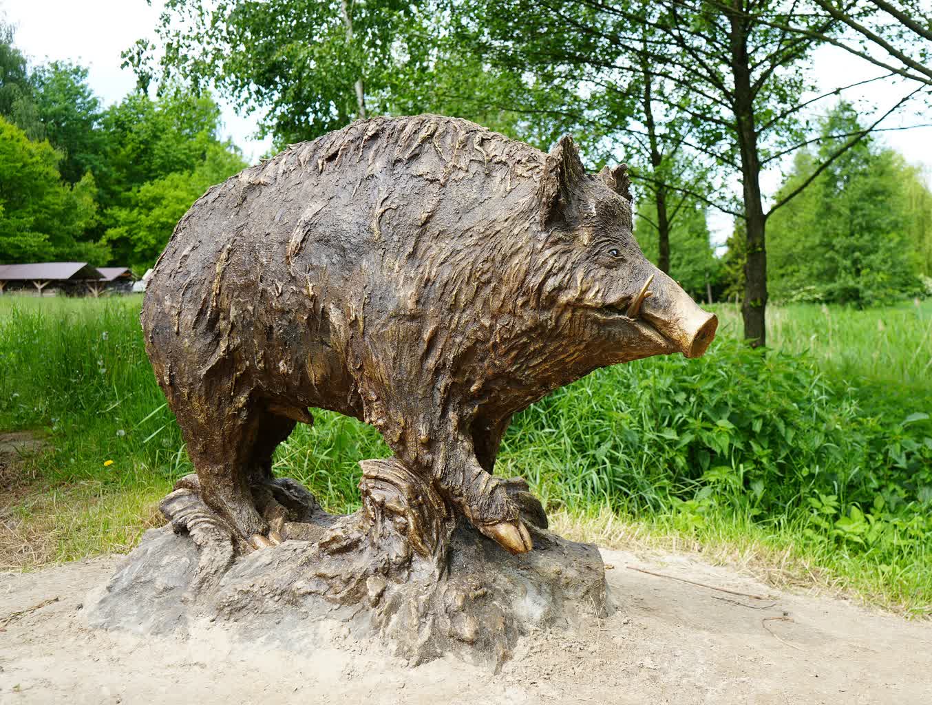 Rzeźbę wykonał pracownik skansenu Szymon Kryński: – Nie ważyliśmy go. Może ważyć około 500-600 kilogramów. Jest to rzeźba wykonana z betonu. Przypatynowana, żeby wyglądał jak odlew z brązu. To jest jego sierść, to są włosy dlatego, że dzik wychodzi z błota. Jest cały oklejony, ma takie dredloki. Błoto zwisa mu z sierści. Brudny jak te, które biegały na terenie skansenu.