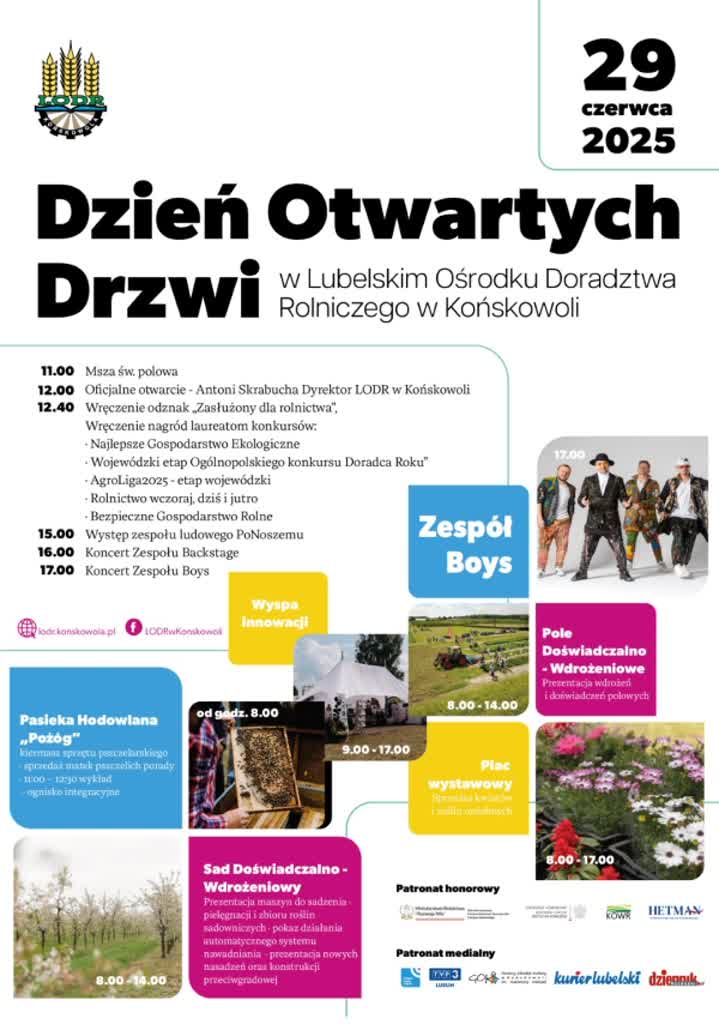 Podczas dnia otwartego Lubelskiego Ośrodka Doradztwa Rolniczego w Końskowoli do 16.00 można oglądać poletka doświadczalne oraz nowoczesne instalacje w sadzie. Potem na boisku przy ulicy Pożowskiej zaplanowano występy sceniczne. O 17.00 wystąpi gwiazda imprezy – zespół Boys.