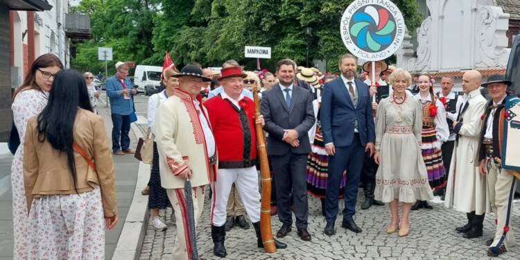 – Na zespół istnieje 40 lat – cieszy się Jacek Szylar. – Właśnie obchodziliśmy z końcem maja 40-lecie, którego już nie zdążyliśmy, bo za dużo mamy obowiązków. No trzeba właśnie było do Kazimierza przyjechać. I zostało to przełożone. Zespół „Sami swoi” z Markowej. Łańcut leży koło Markowej, gdzie mamy słynne muzeum rodziny Ulmów. Szerzymy kulturę, naszą rzeszowską, markowską. Po okolicach i po całej Polsce. Staramy się robić takie wywiady starszych osób, najstarszych, żeby nam jeszcze zaśpiewały, słowa podały. Część pamiętamy, bo ja już bardzo dużo tańczę, od 14. roku życia. I to się tak nawarstwia. Gdzie się pojedzie, coś się łapie. Pan Janek nam to opracowuje i śpiewamy tak jak było słychać.