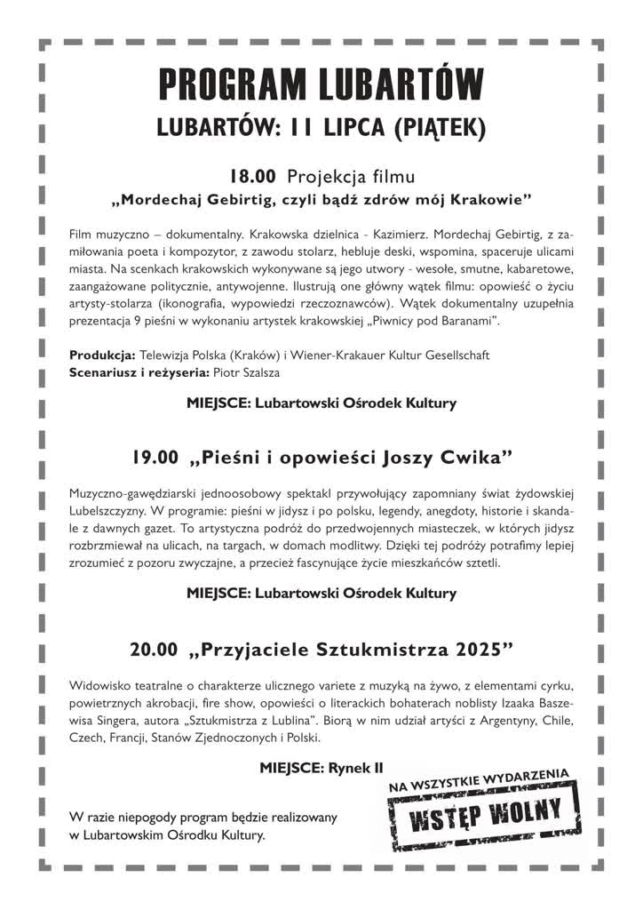 Festiwal rozpocznie się w każdej z miejscowości od filmu muzyczno-dokumentalnego „Mordechaj Gebirtig, czyli bądź zdrów mój Krakowie”. Film opowiada o Mordechaju Gebirtigu, który z zamiłowania był poetą i kompozytorem, a z zawodu stolarzem. Następnie zaplanowano muzyczno-gawędziarski jednoosobowy spektakl „Pieśni i opowieści Joszy Cwika”. Na koniec odbędzie się widowisko „Przyjaciele Sztukmistrza 2025”.