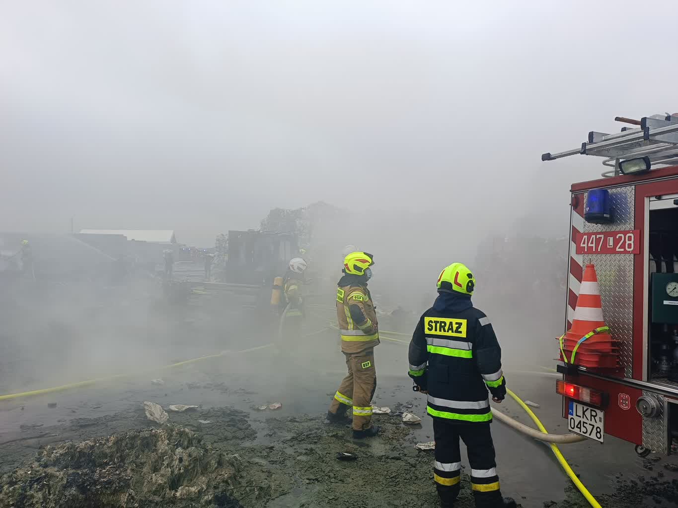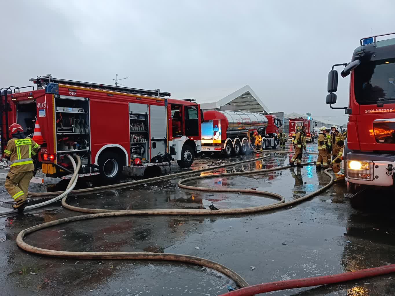 Trwa dogaszanie pożaru zakładu przetwórstwa odpadów plastikowych w Rzeczycy Ziemiańskiej. W akcji gaśniczej bierze udział 31 zastępów straży pożarnej – z jednostek z terenu całego województwa lubelskiego, w tym cysterny zapewniające ciągłość dostaw wody dla prowadzących działania gaśnicze.