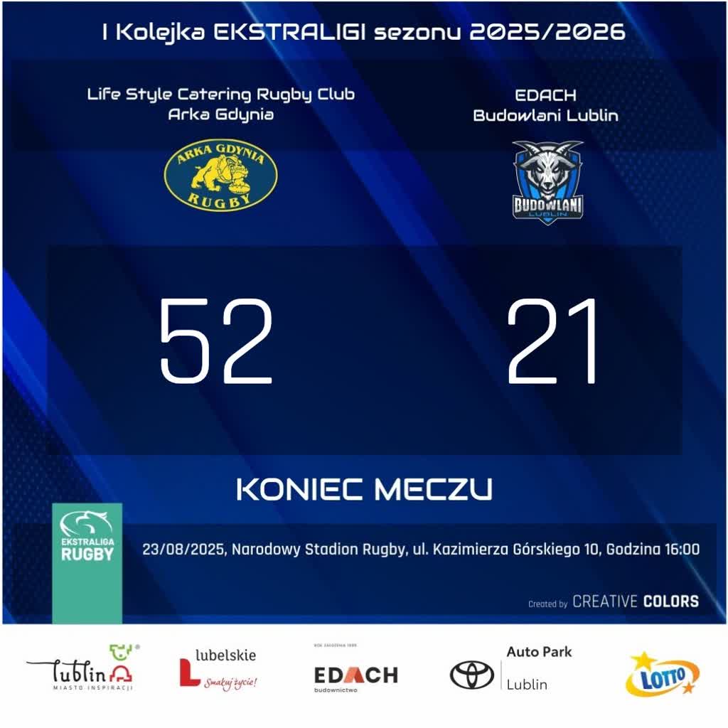 Rugbiści Edach Budowlanych Lublin przegrali na wyjeździe z Arką Gdynia 21:52 na inaugurację nowego sezonu Ekstraligi. Najwięcej punktów dla lubelskiego zespołu zdobył Kuzikwashe Kazembe – 6.