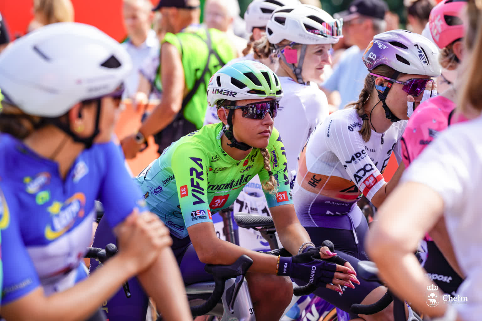 Czołówka na razie składa się z kilkunastu kolarek, bowiem od premii lotnej, która miała miejsce na 32 km przed metą w gminie Chełm, do przodu ruszyła liderka Chiara Consonni, a także wiceliderka, czyli Clara Copponi. Ruszyły, walcząc o te bonifikaty i rozerwały peleton na 2-3 grupy. Teraz liderka gdzieś schowana za trzema pierwszymi zawodniczkami drużyny Lidl-Trek, a więc tej drużyny, w której jeździ wiceliderka Clara Copponi.