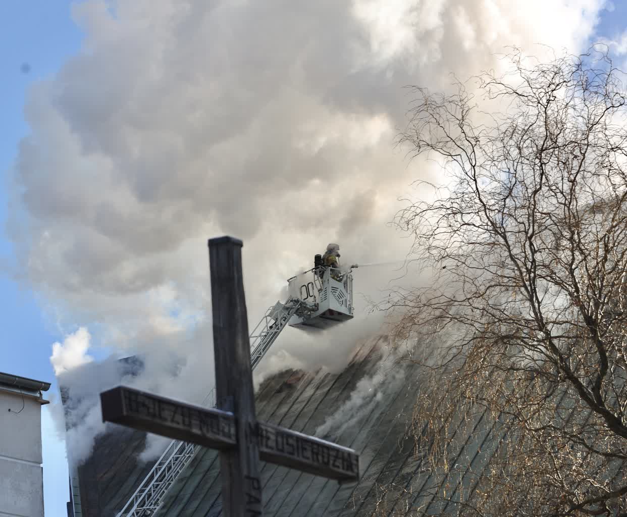 Trwa dogaszanie pożaru dachu i poddasza kościoła przy ulicy Kunickiego w Lublinie. Ogień jako pierwszy zauważył ksiądz proboszcz na 10 minut przed pierwszą poranną mszą świętą. I to on wyprowadził z kościoła grupę parafian.