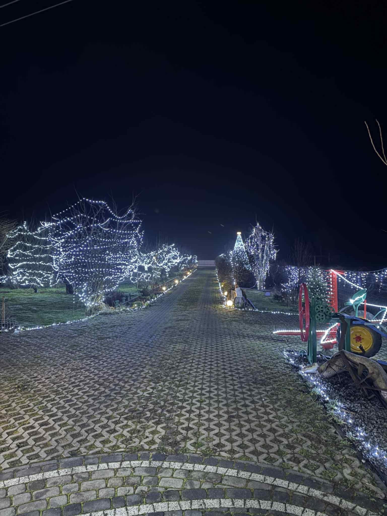 – Światełka mamy nie tylko na domu, ale chociażby na dwudziestu drzewach – mówi autorka iluminacji, Beata Daszkiewicz. – Mamy ubrany wóz, to już w zeszłym roku mąż go odnowił. Latem mamy truskawki na nim, a zimą go ubieramy. Tutaj ta stara huśtawka jest ubrana, tutaj ten krzaczek, tam u pieska drzewo jest okręcone, brzoza. Tutaj ten duży bez. Tu mąż pozakładał na balkony, przy rynnie, to wszystko się świeci. Około 10 kompletów jest po 1000 światełek, około 10 kompletów po 500 światełek, no i cała masa jest takich po 300, po 400, po 600. Wszystkie drzewka wzdłuż drogi są poubierane, no i tu w sadku jest parę drzewek ubranych.