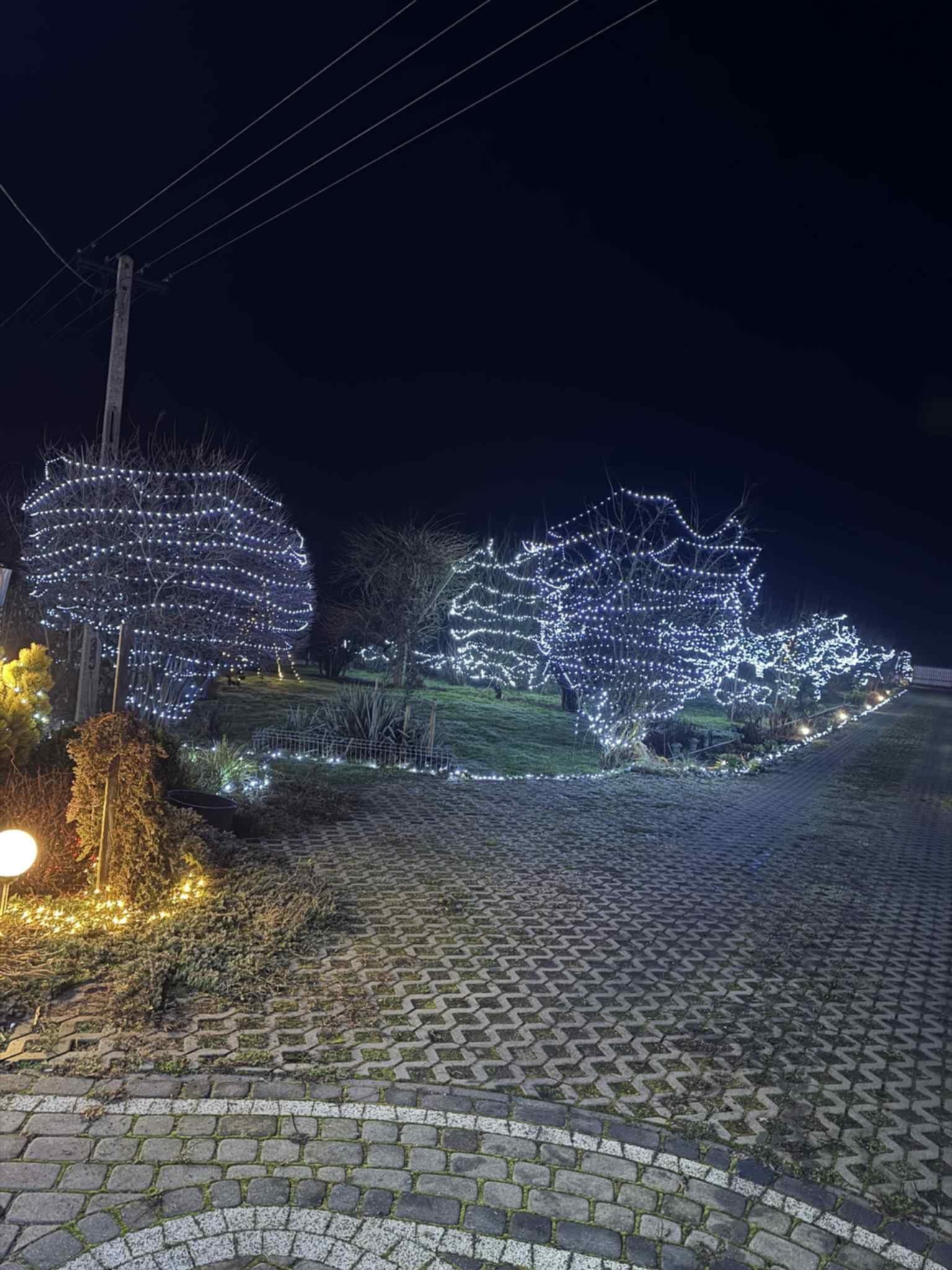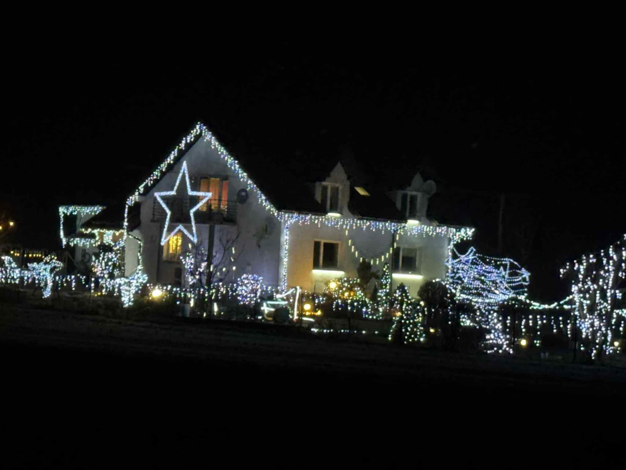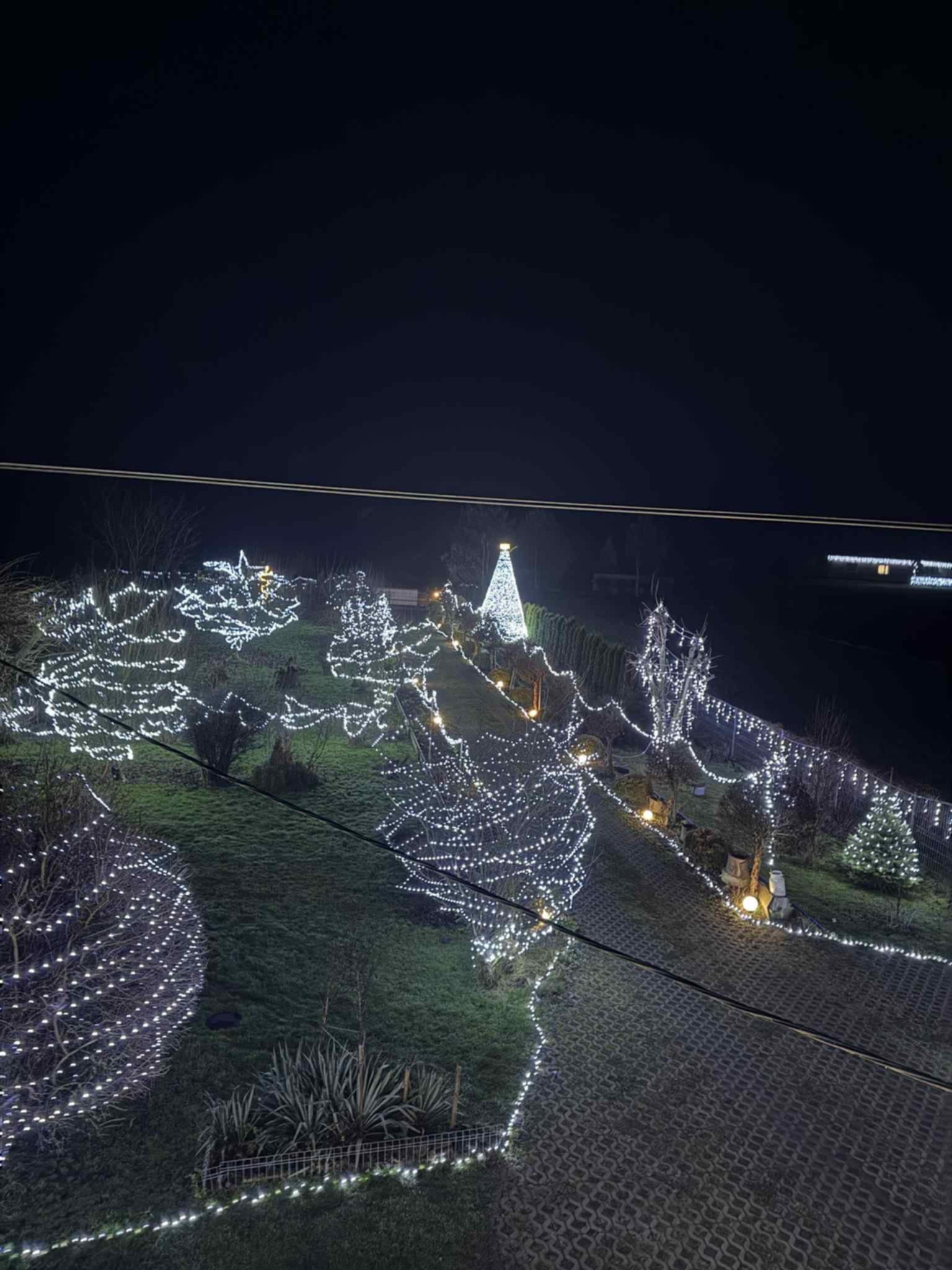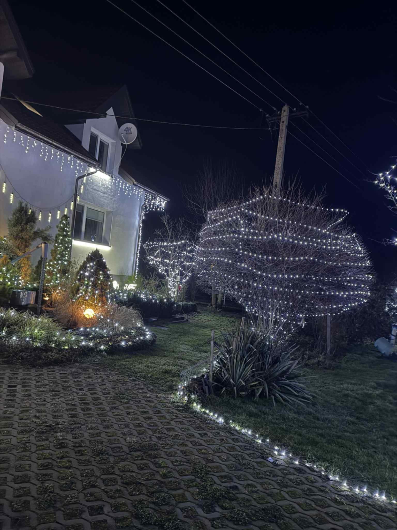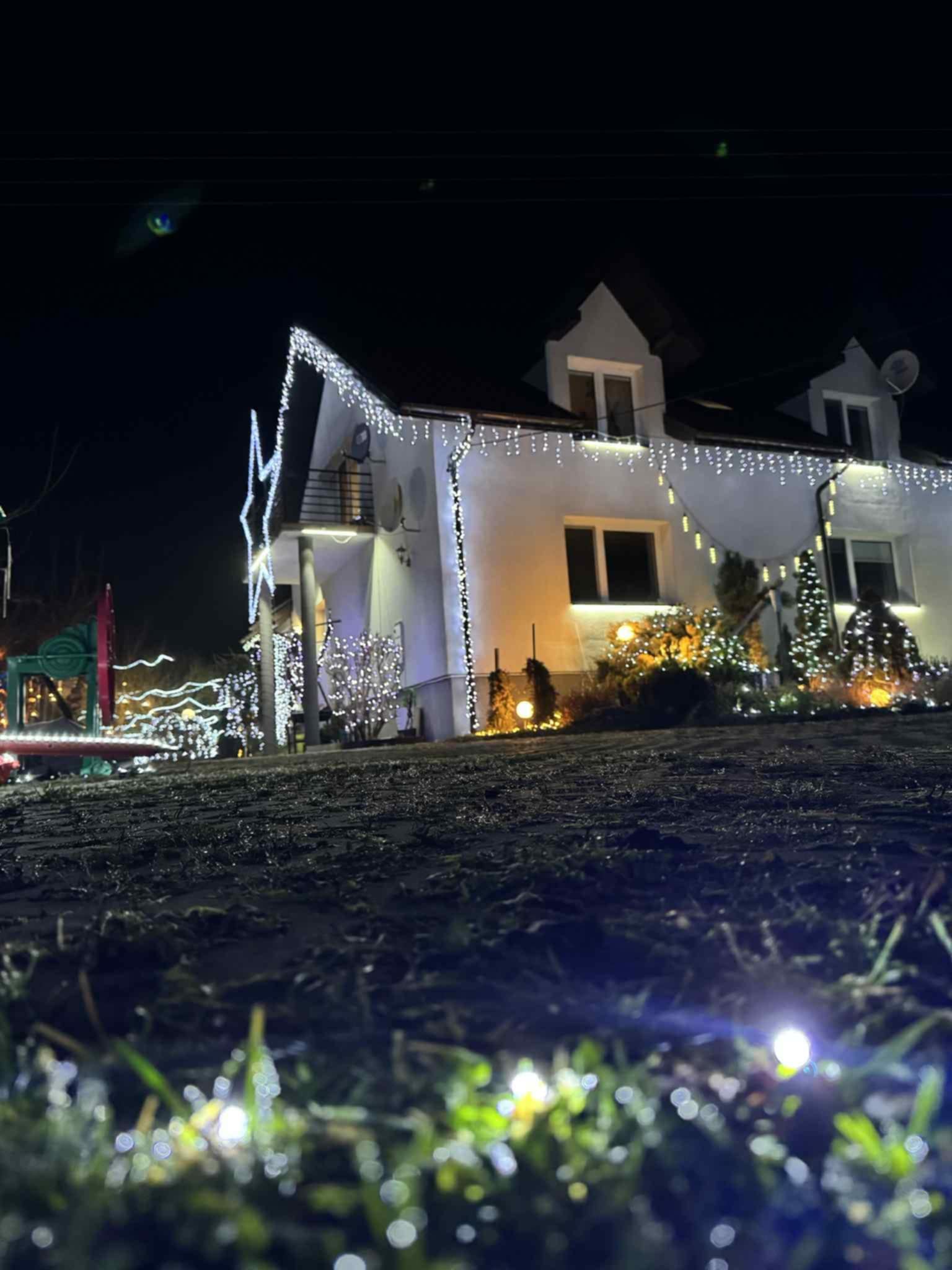 – Chyba w tym roku najładniejsze są te gwiazdy, które zrobił sąsiad. Aczkolwiek przybyło dużo nowych lampek w całym ogrodzie, po prawej stronie. Dach oświetlony. To wszystko zrobiło fajny smaczek.
