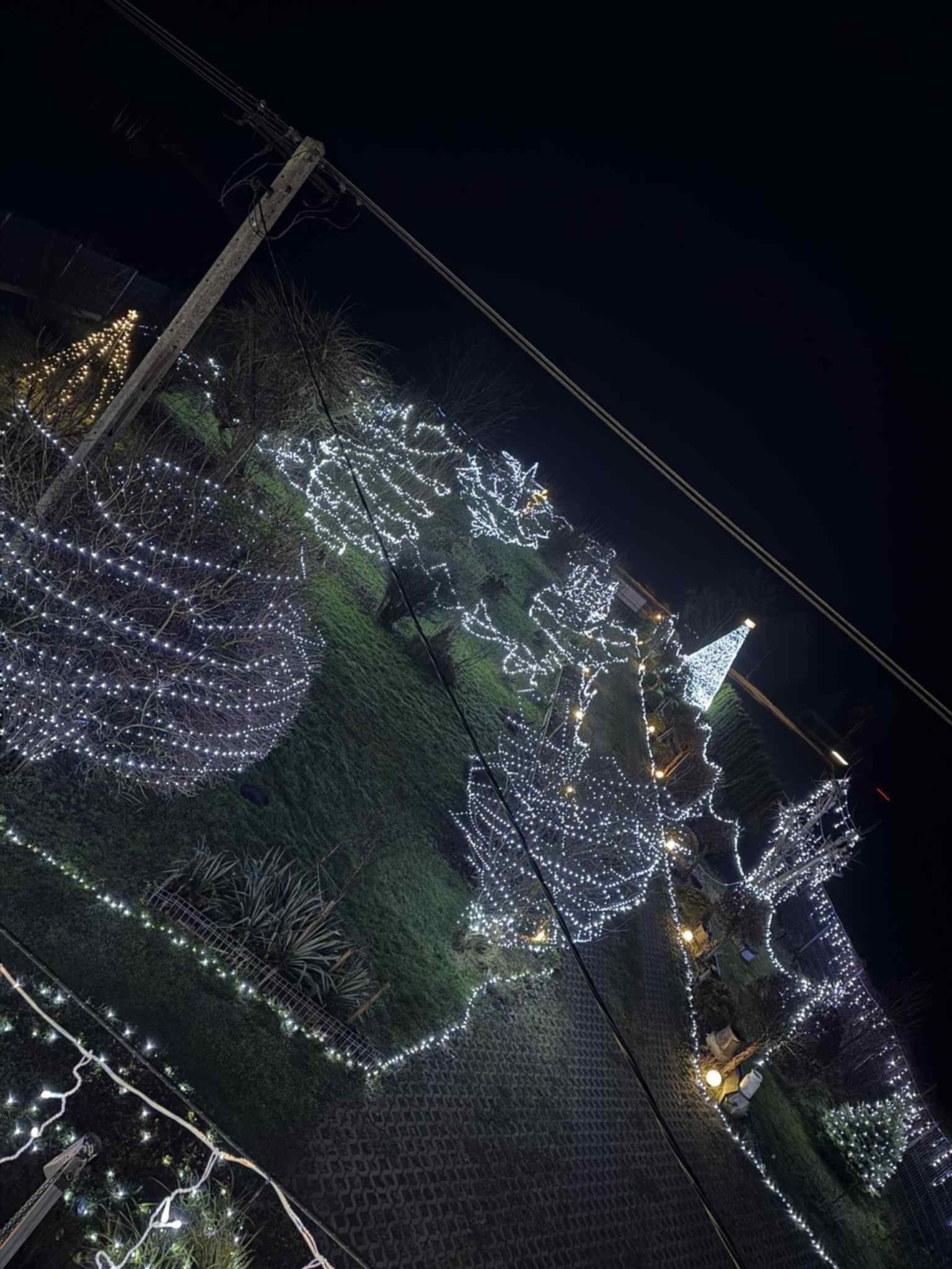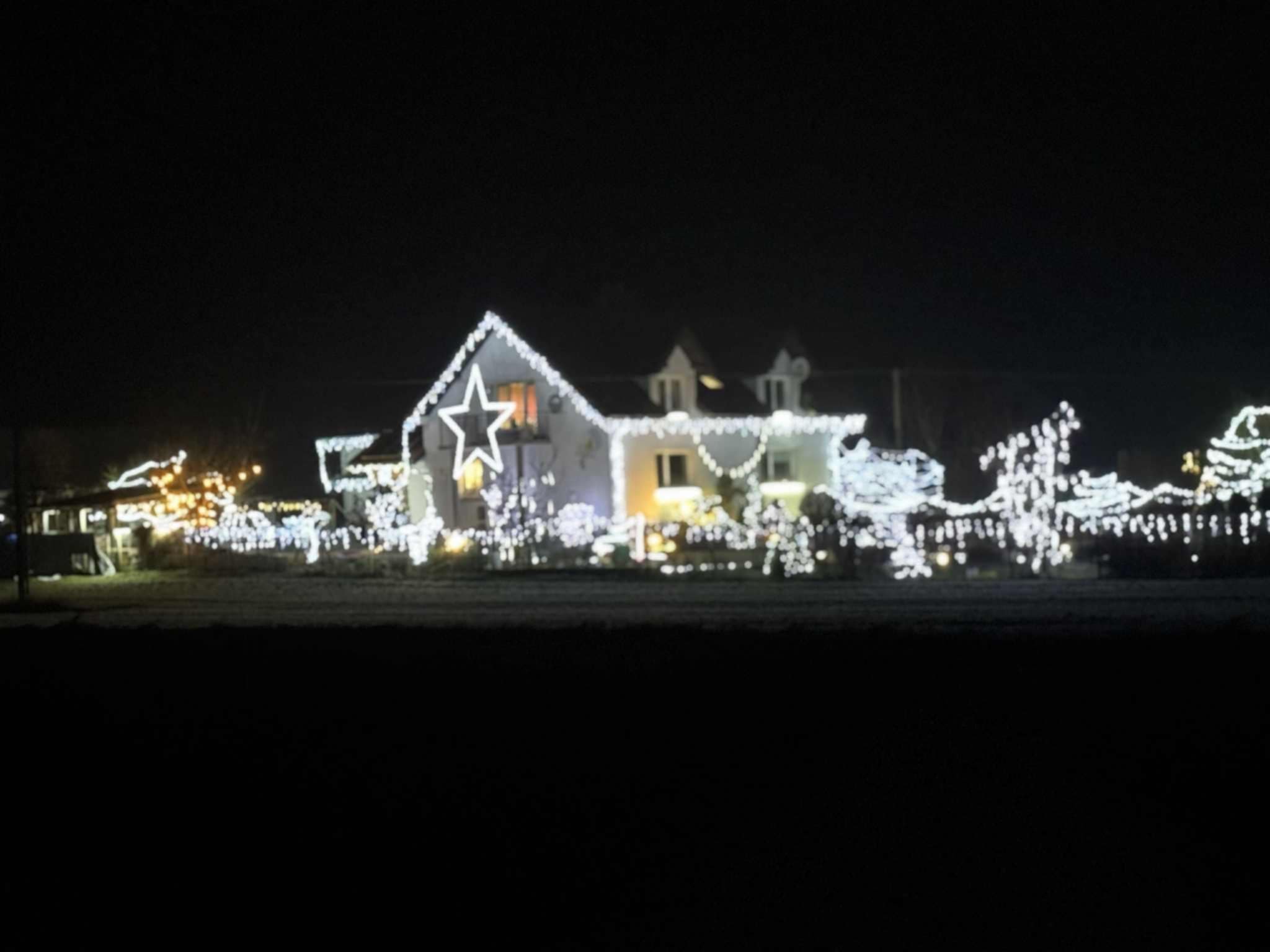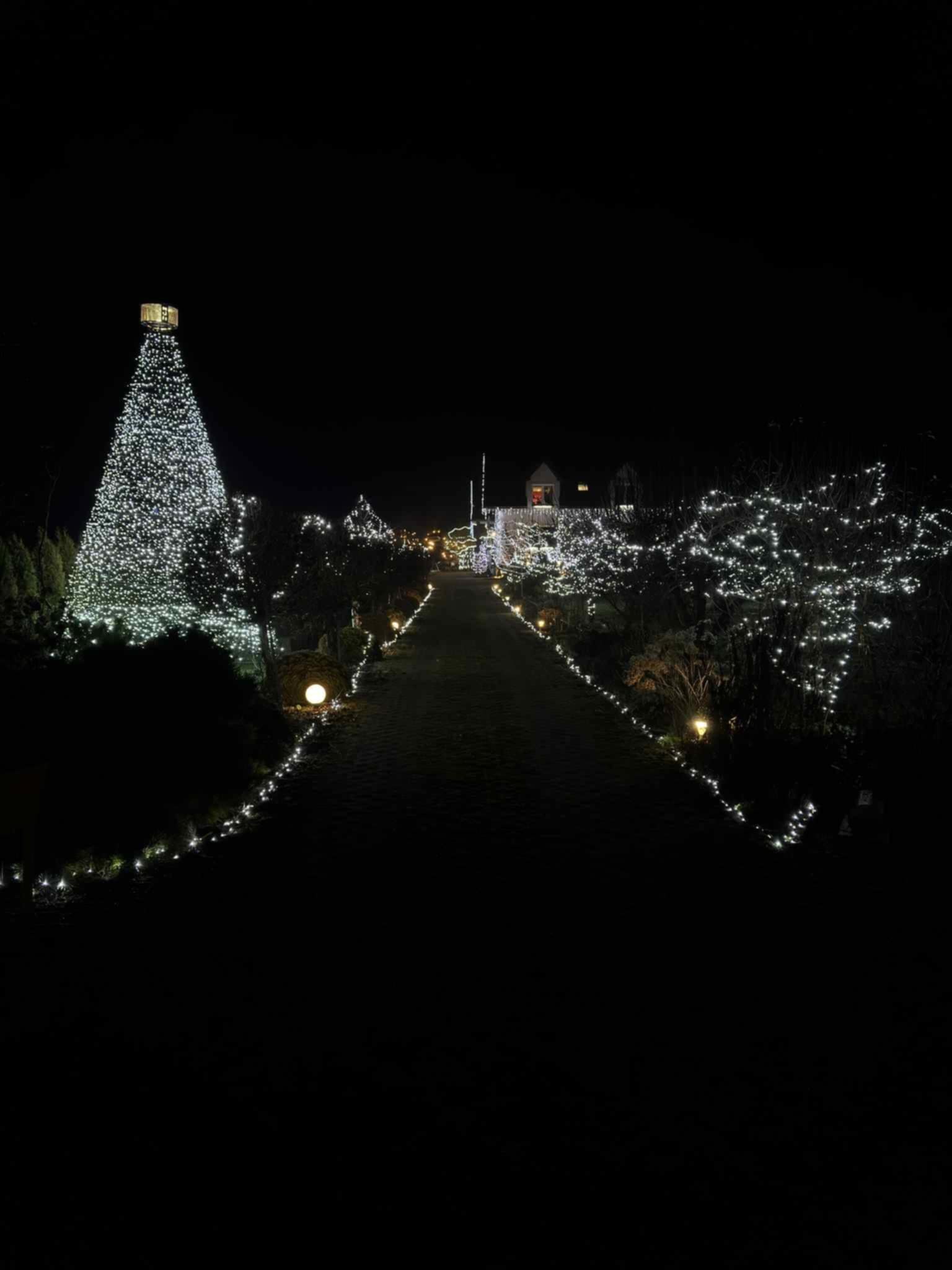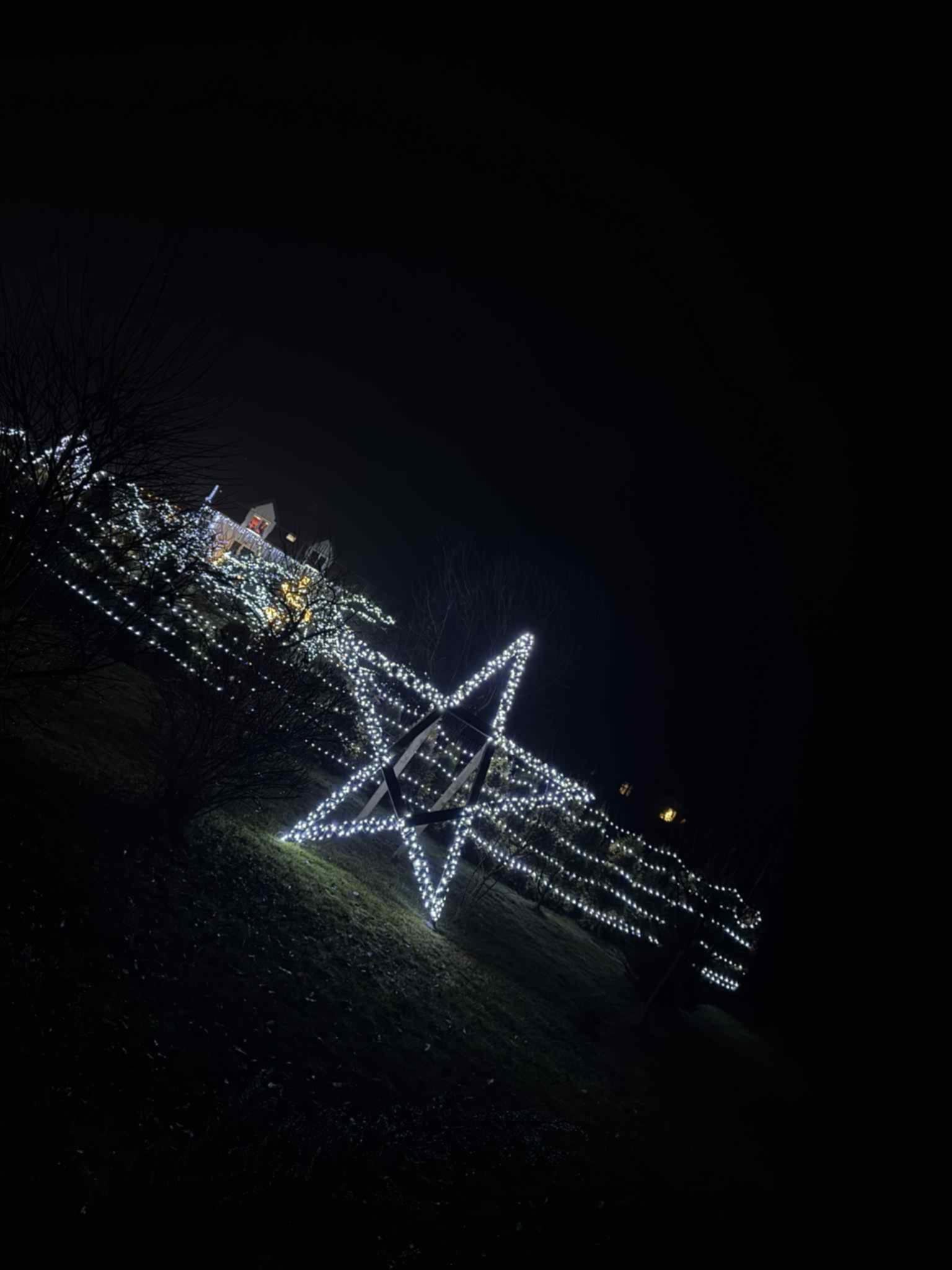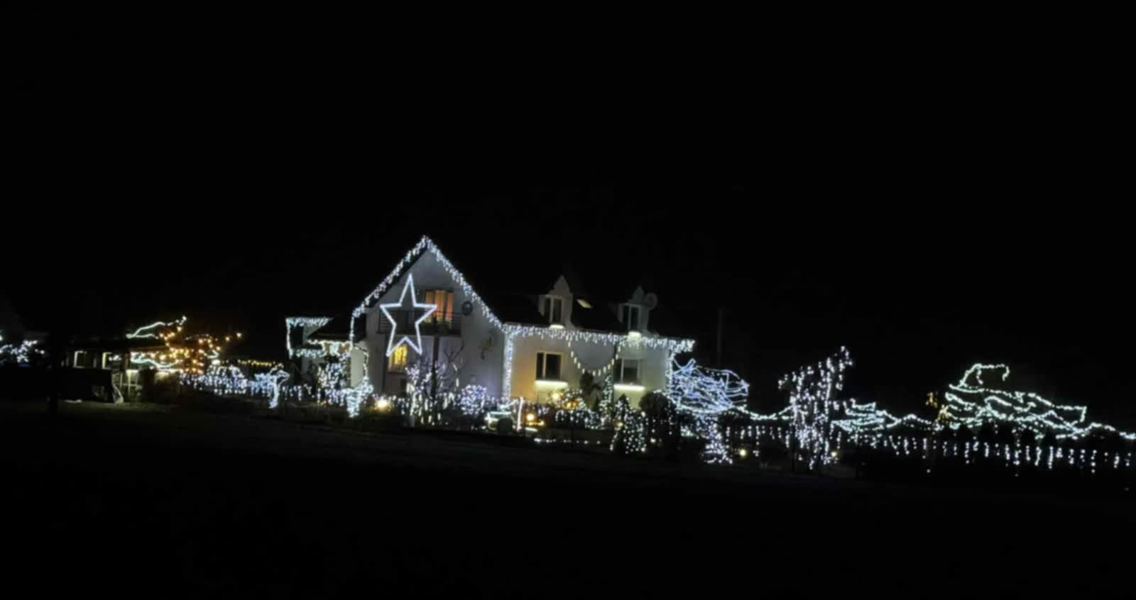 – Chyba w tym roku najładniejsze są te gwiazdy, które zrobił sąsiad. Aczkolwiek przybyło dużo nowych lampek w całym ogrodzie, po prawej stronie. Dach oświetlony. To wszystko zrobiło fajny smaczek.