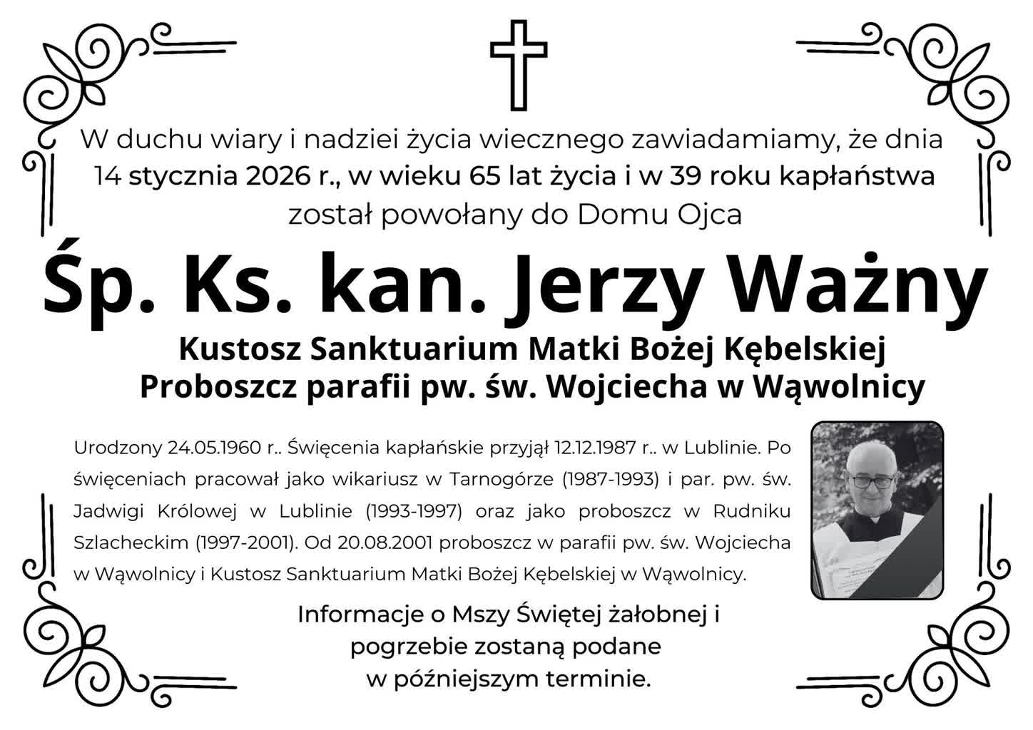 Nie żyje kustosz Sanktuarium Matki Bożej Kębelskiej w Wąwolnicy, ksiądz kanonik Jerzy Ważny. Zmarł dziś (14.01) nad ranem po ciężkiej chorobie. Miał 65 lat.