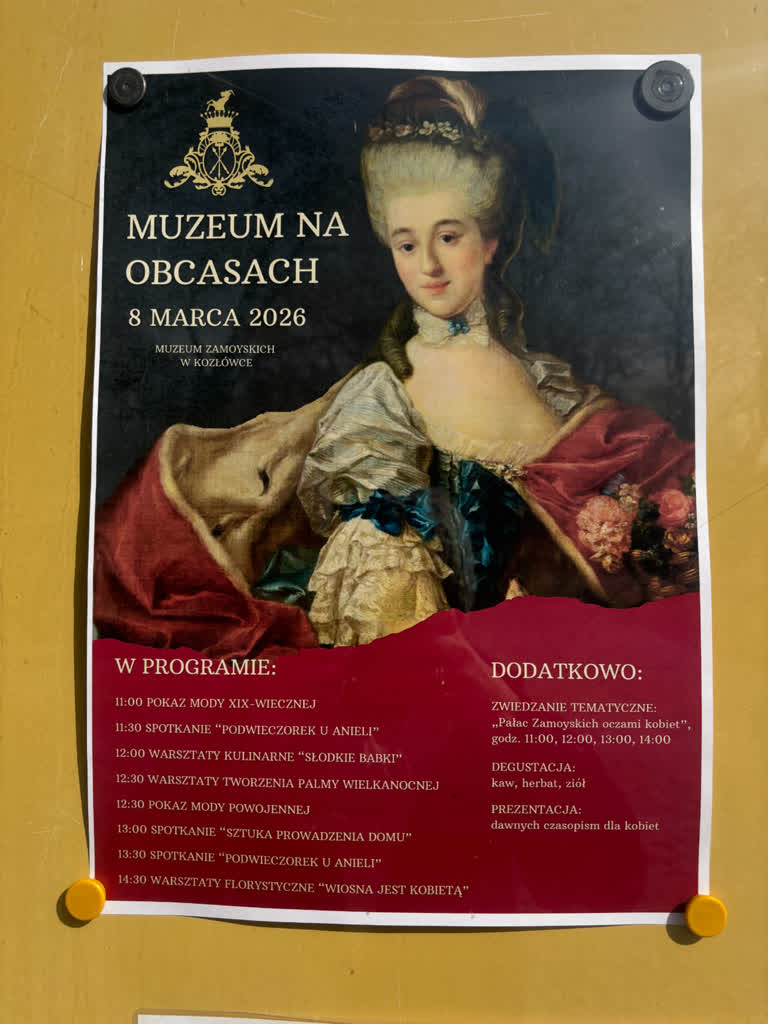 Z okazji Dnia Kobiet Muzeum Zamoyskich w Kozłówce zaprosiło na kolejną edycję wydarzenia „Muzeum na obcasach”, które miało miejsce w niedzielę, 8 marca br. Był to dzień poświęcony kobietom – ich historii, codzienności, stylowi życia oraz roli, jaką odgrywały i nadal odgrywają w przestrzeni społecznej, rodzinnej i kulturalnej. „Muzeum na obcasach” to spojrzenie na dzieje Kozłówki z kobiecej perspektywy. W tym roku organizatorzy zaprosili uczestników do odkrywania pałacowych wnętrz i muzealnych przestrzeni poprzez opowieści o kobietach XIX i XX wieku – od arystokratek związanych z rodziną Zamoyskich po bohaterki codzienności, których życie toczyło się wokół domu, pracy i zmieniających się realiów społecznych a także w kameralnych spotkaniach inspirowanych dawnymi rytuałami towarzyskimi i kulturą codzienności, takich jak „Podwieczorek u Anieli”. Szczególnym punktem programu było zwiedzanie tematyczne zatytułowane: „Pałac Zamoyskich oczami kobiet”, prowadzące przez wnętrza pałacu z naciskiem na historie i role kobiet związanych z tym miejscem.