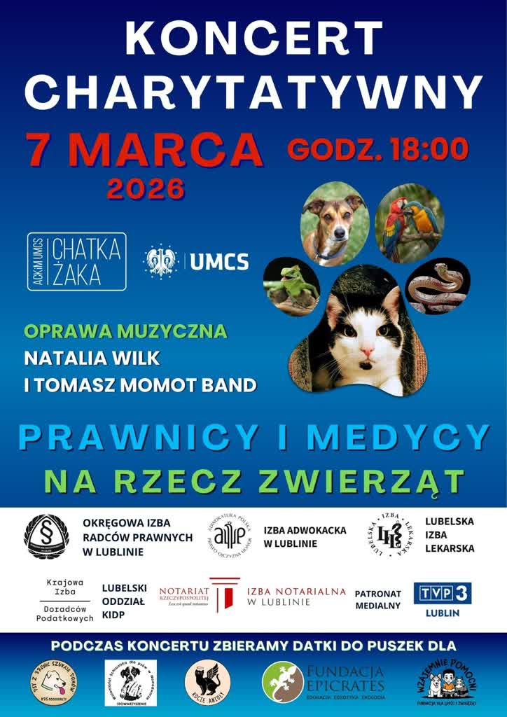 W Akademickim Centrum Kultury i Mediów UMCS „Chatka Żaka” odbędzie się koncert charytatywny „Prawnicy i Medycy na Rzecz Zwierząt”.