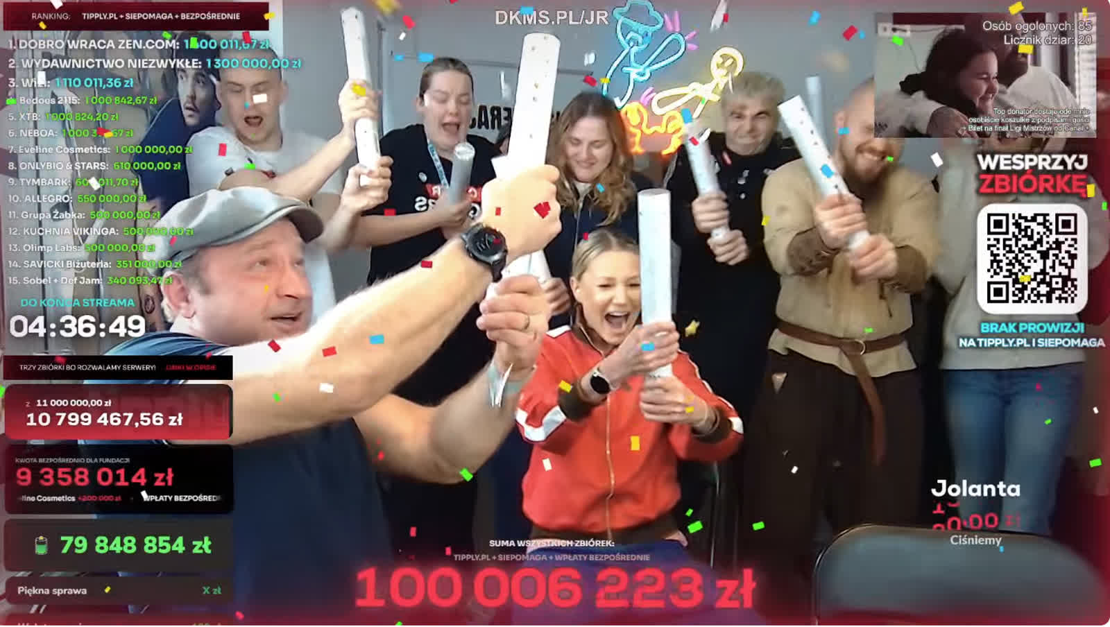 Influencer Łatwogang apelował o dalsze wsparcie: – Piękna sprawa, niesamowita ilość. Ale to nie jest powód do zwalniania, tylko do przyspieszania. To jest dowód na to, że potrafimy i możemy jeszcze lepiej. W półtorej godziny zebraliśmy 20 milionów, więc w tym tempie powinniśmy dzisiaj za 4,5 godziny zebrać około – matematycznie licząc – 160 milionów. Więc zróbmy to, mierzmy jak najwyżej dla naszych dzieciaków i celujmy nawet w 200 milionów.