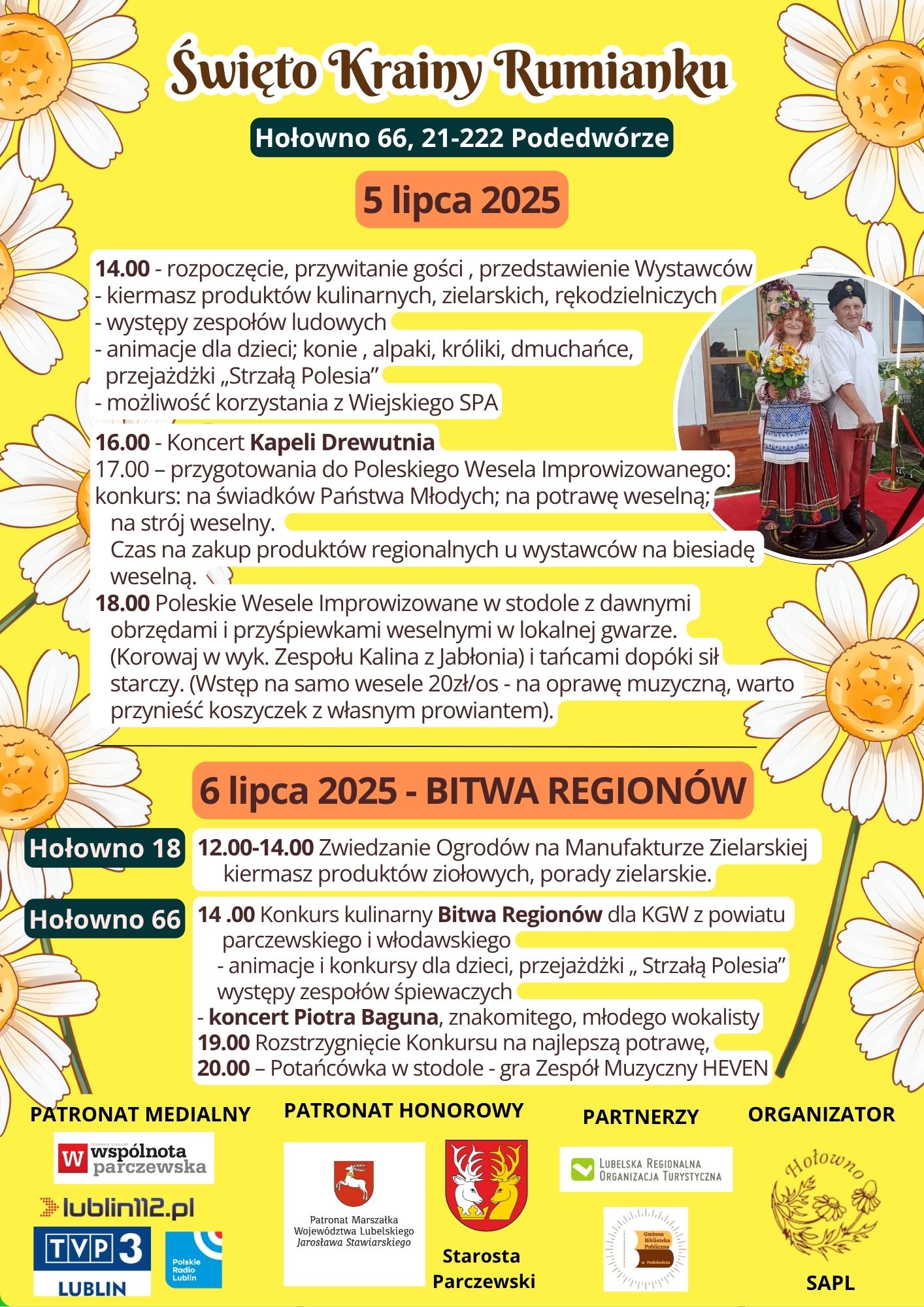 ukoronowaniem wieloletniej pracy u podstaw naszego Stowarzyszenia na rzecz rozwoju obszarów wiejskich. Jest to produkt flagowy wpisany na trwałe w kalendarz imprez kulturalnych woj. Lubelskiego. Celem niniejszego wydarzenia jest pokazanie bogactwa naszego regionu zarówno w sferze kulinarnej jak obrzędowej i językowej, aby goście mogli poczuć jak „smakuje lubelskie”. Tematem przewodnim jubileuszowego Święta będzie Improwizowane Wesele Poleskie w stodole, które w latach 2023-2024 okazało się prawdziwym Hitem. Jak co roku będzie także strefa dla dzieci: animacje, alpaki, konie, plac zabaw oraz dmuchańce. Zaprezentujemy także unikalny język wschodniego pogranicza poprzez występy zespołów mających w swoim repertuarze obrzędy i pieśni w tym